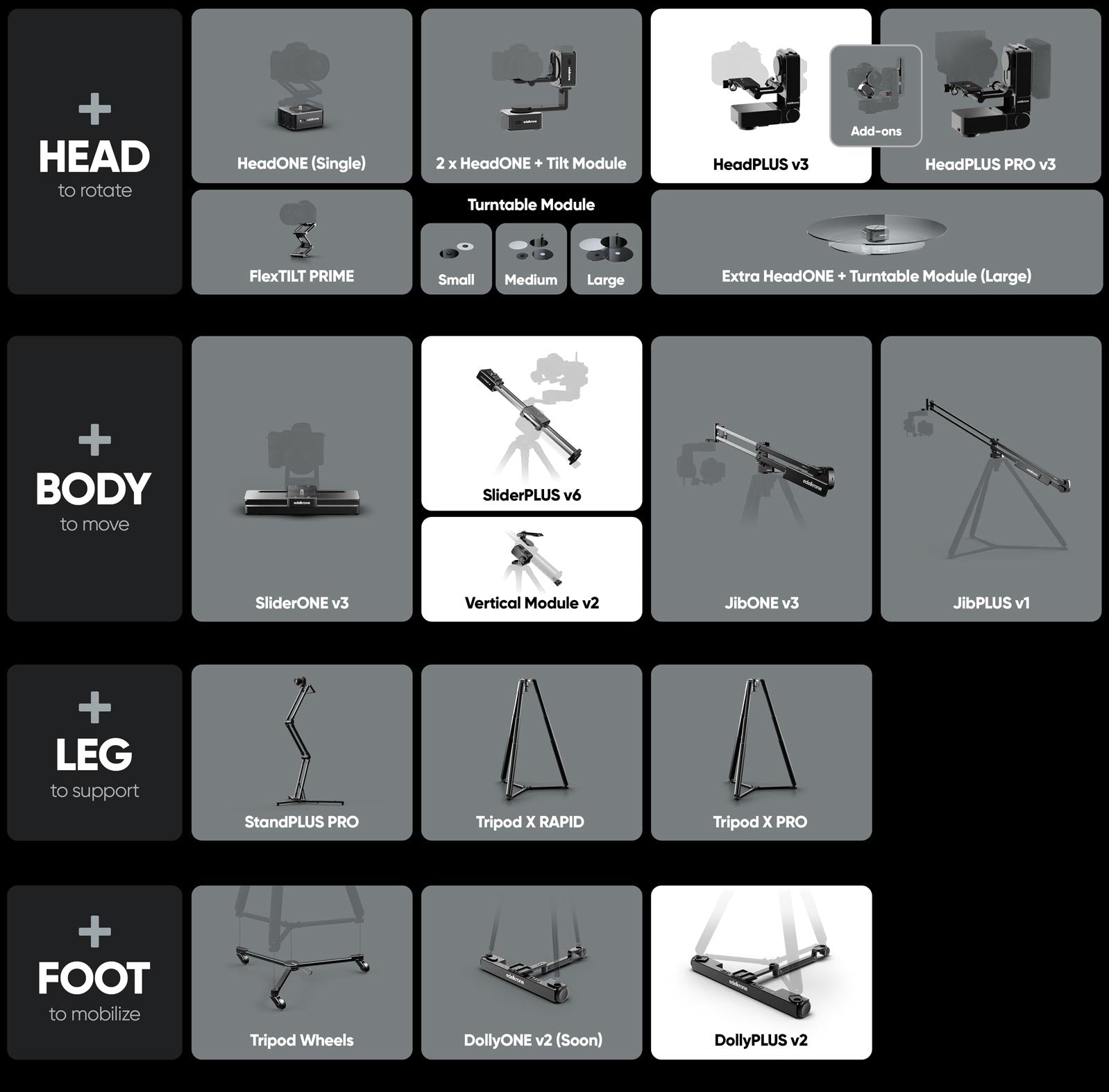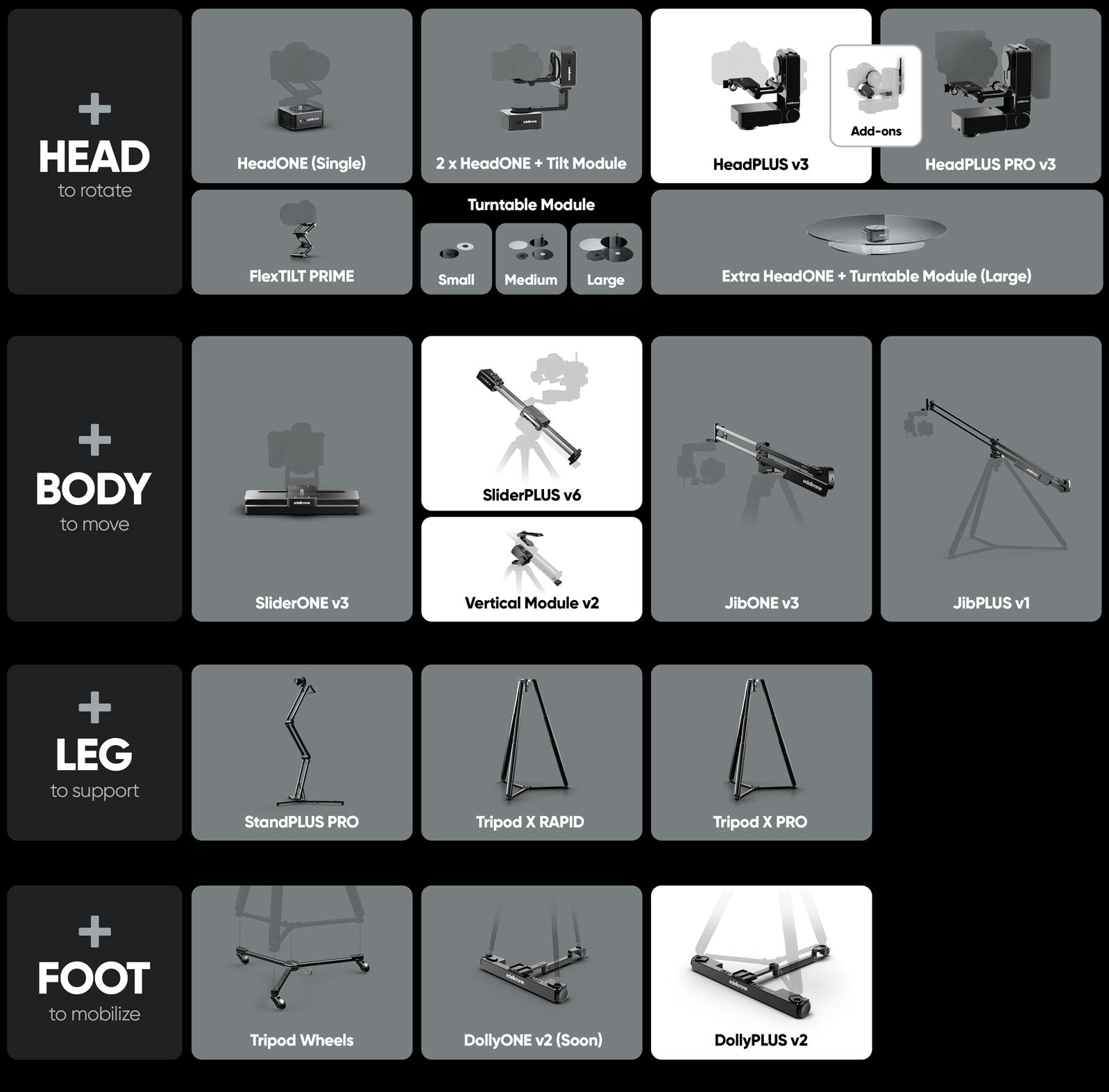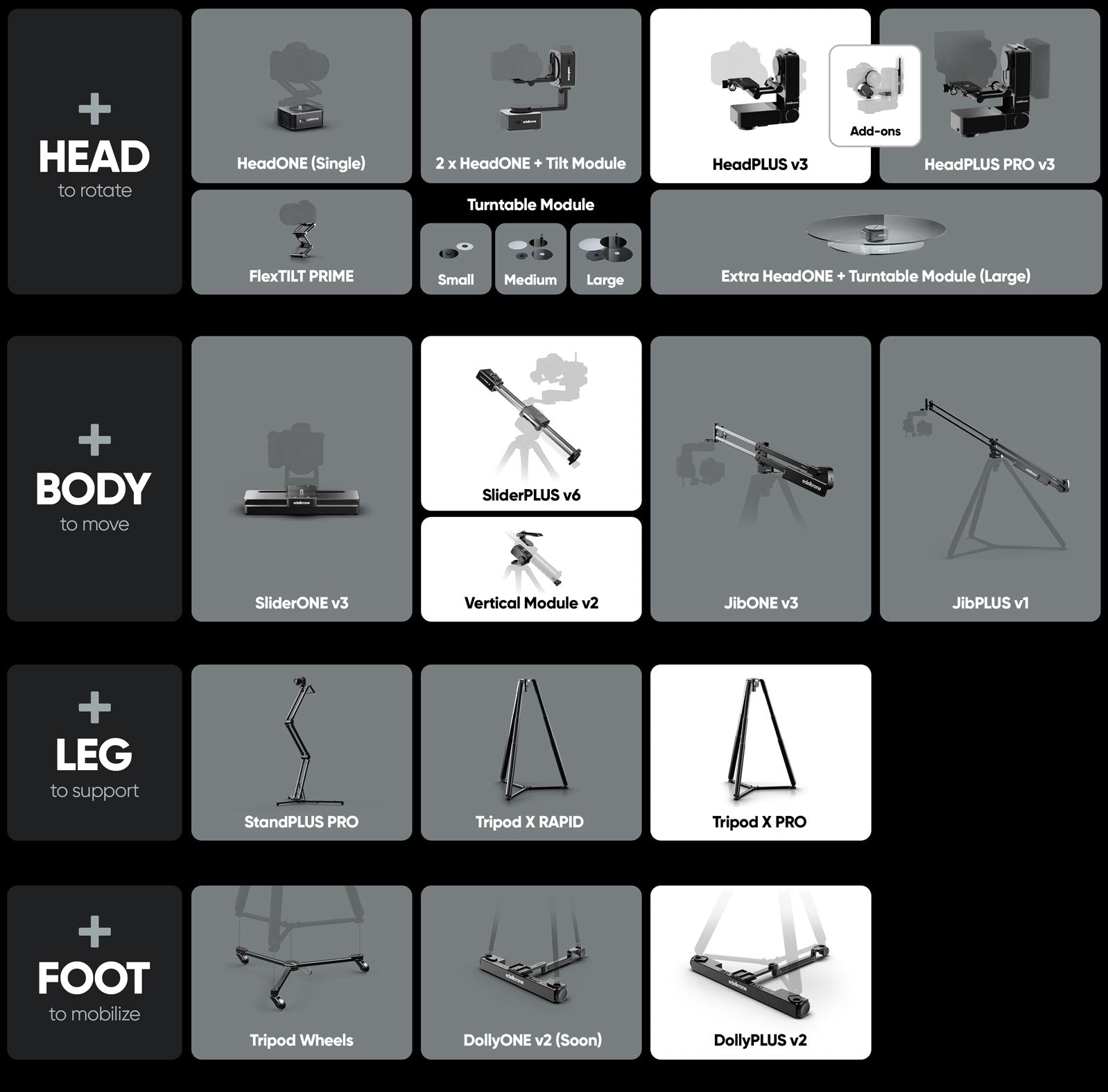 This bundle uses DollyPLUS v2 as the base, SliderPLUS v6 with Vertical Module v2 as the body, and HeadPLUS v3 as the head, creating a fully integrated system with complete mobility and flexibility for any kind of motion control setup.